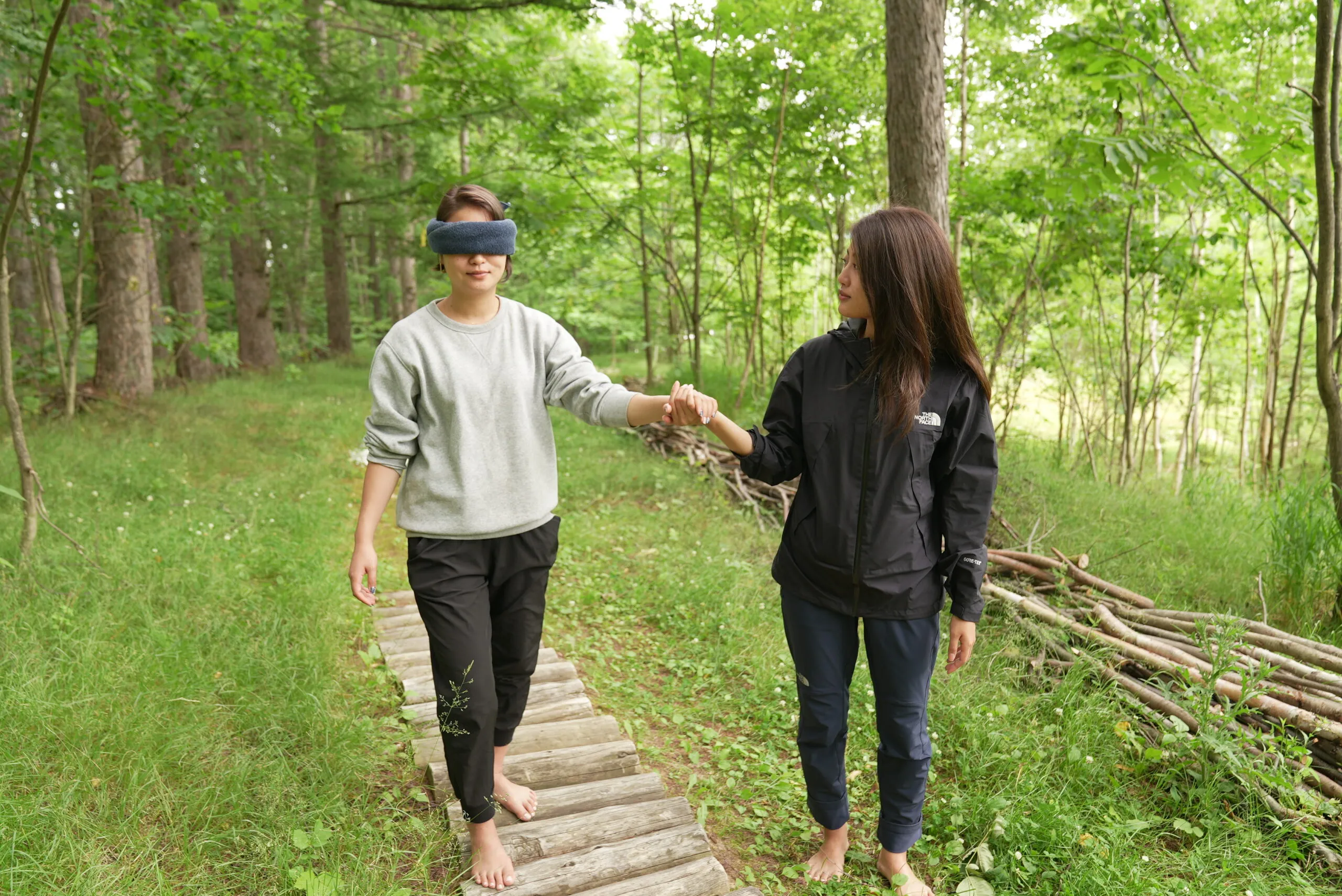 目隠しをして裸足になり、芝生・砂利・落ち葉・丸太などの工夫された道を歩きます。