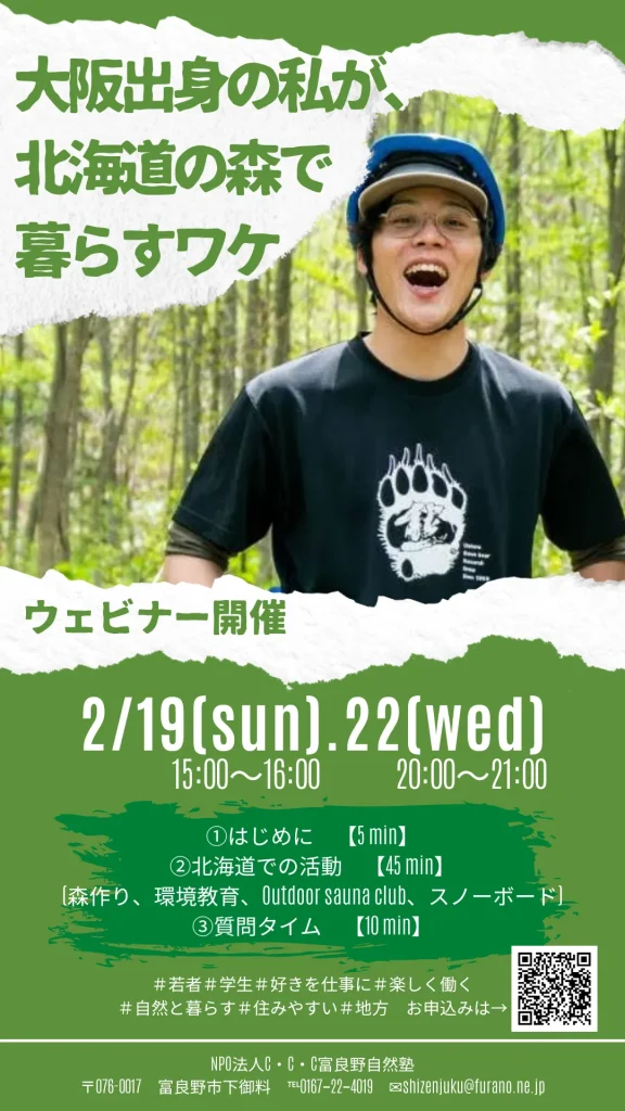 2月19日(日),22日(水)自然塾ウェビナー開催! 2023年2月16日 最終更新日時 : 2026年2月26日 mK3kbxep 2月19日(日),22日(水)ウェビナー開催 テーマ【大阪出身の私が、北海道の森で暮らすワケ】